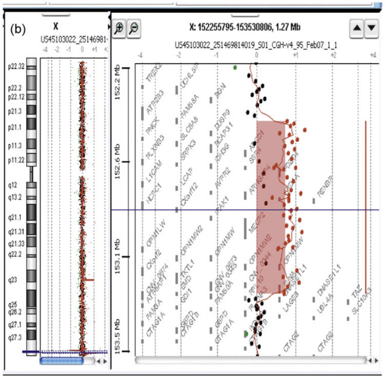 Figure 2 : Exemple d’un rapport d’une puce à oligonucléotides de la firme Agilent Technologies avec identification d’un gain en Xq28 (Jonveaux, 2010). À gauche est représenté le pictogramme du chromosome X avec une déviation reconnue par le logiciel dans la partie terminale du bras long du chromosome X (ligne bleue). À droite est représenté un zoom de la région en déséquilibre avec chaque point rouge du graphique correspondant à une cible. V) Interprétation des résultats L’interprétation quantitative des résultats de l’hybridation génomique comparative se fait par l’interprétation de la courbe de résultats (figure 2). En pratique, pour chaque cible étudiée,