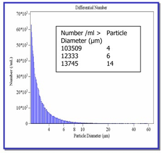 Figure 3 : dénombrement cellulaire (/ml) en fonction du diamètre des cellules (µm) par le Multisizer3. (AZO NETWORK, 2014) V) Interprétation des résultatsLa figure 2 présente 2 graphiques obtenus de couleurs différentes correspondent à 2 échantillons différents. Le graphique rouge présente une concentration cellulaire plus importante que l’échantillon bleu. Également, les cellules de l’échantillon rouge sont de plus grandes tailles. Puis, pour la figure 3, l’encadré présente le nombre total de particules, ainsi que la distribution du nombre et des tailles de celles-ci en fonction d’une classification. Sur les 2 figures (figures 2 et 3), plus la taille des cellules augmente, plus le nombre de cellules par mL diminue. (BECKMAN COULTER, 2023 ; AZO NETWORK, 2014) VI) Intérêts et limitesCette méthode comporte plusieurs avantages : elle permet de dénombrer un très grand nombre de particules différentes (bactéries, levures, mitochondries, cellules sanguines, …), peu importe leurs caractéristiques physiques (forme, couleur), et près de 10 000 particules par seconde peuvent être dénombrées de taille comprise entre 0,4 et 1 600 µm. Ainsi, cette méthode donne des résultats très précis. Également, l’obtention de la distribution des tailles peut être réalisée en un temps relativement court. L’automatisation de la méthode permet une grande rapidité et une limitation des erreurs liée au comptage manuel. (KHALIFA M. A., 2021) Cependant, l’instrumentation nécessaire représente un budget important et cette méthode ne peut pas s’appliquer à toutes les particules. En effet, la méthode Coulter ne peut être utilisée pour les particules de trop petite taille et qui ne peuvent pas être mises en suspension dans une solution électrolytique. Le comptage est dépendant de l’orifice sélectionné ; un mauvais choix induira un résultat biaisé, car les particules ne pourront passer ou passeront trop vite et seront mal comptées par l’appareil. (BECKMAN COULTER, 2023) VII) Références bibliographiquesAZO NETWORK, (2014). Using the MultisizerTM 3 Coulter Counter to Determine the Size and Concentration of Particles in Oil. AZoM.com. Disponible à l’adresse : https://www.azom.com/article.aspx?ArticleID=11501 BECKMAN COULTER, (2023). Coulter Principle, Counting and Sizing Particles. Disponible à l’adresse : https://www.beckman.fr/resources/technologies/flow-cytometry/history/coulter-principle BHATTACHARJEE. S (2019). Coulter Counter. Disponible à l’adresse : KHALIFA M. A., (2021). Coulter Counter Method | Conductivity Method of particle analysis | Micromeritics | Animation. Disponible à l’adresse : FINOT. E., (2010). Electrocinétique 2.3 : Compteur de Coulter. Disponible à l’adresse : GRAHAM, M., (2013). The Coulter principle: Imaginary origins. Cytometry. Vol. 83, (n° 12), pp. 1057‑1061. DOI 10.1002/cyto.a.22398. GRAPPIN, R. et JEUNET, R., (1971). Essais de l’appareil " Compteur Coulter " utilisé pour la détermination du nombre de cellules totales des laits de troupeaux. Le Lait. Vol. 51, (n° 505‑506), pp. 273‑293. DOI 10.1051/lait:1971505-50615. KEBBAL, S., GHARBI, I., GUEMRA, S., HANZEN, C. et GUETARNI, D., (2008). Validation d’une méthode de dénombrement de la concentration en cellules somatiques du lait de vache au moyen du Coulter Counter® modèle Z2. Annales de Médecine Vétérinaire. Vol. 152, (n° 4) Disponible à l’adresse : https://orbi.uliege.be/handle/2268/59670 ROBERT, R., (1985). Intérêt du compteur de particules ZB-ZBI et de l’analyseur C1000 pour la numération des algues unicellulaires de culture. Revue des Travaux de l’Institut des Pêches Maritimes. Vol. 49, (n° 3‑4), pp. 155‑163. | ||